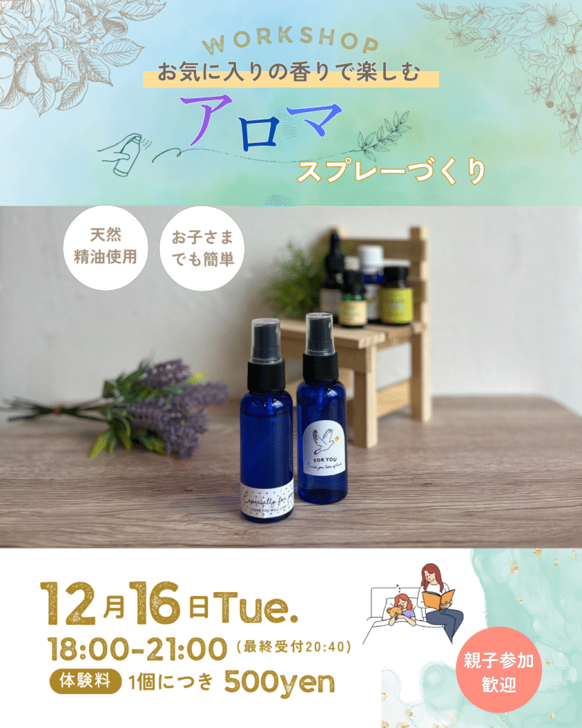 今回は平日夜18:00-21:00にて「アロマスプレー作り」を開催します🎀✨